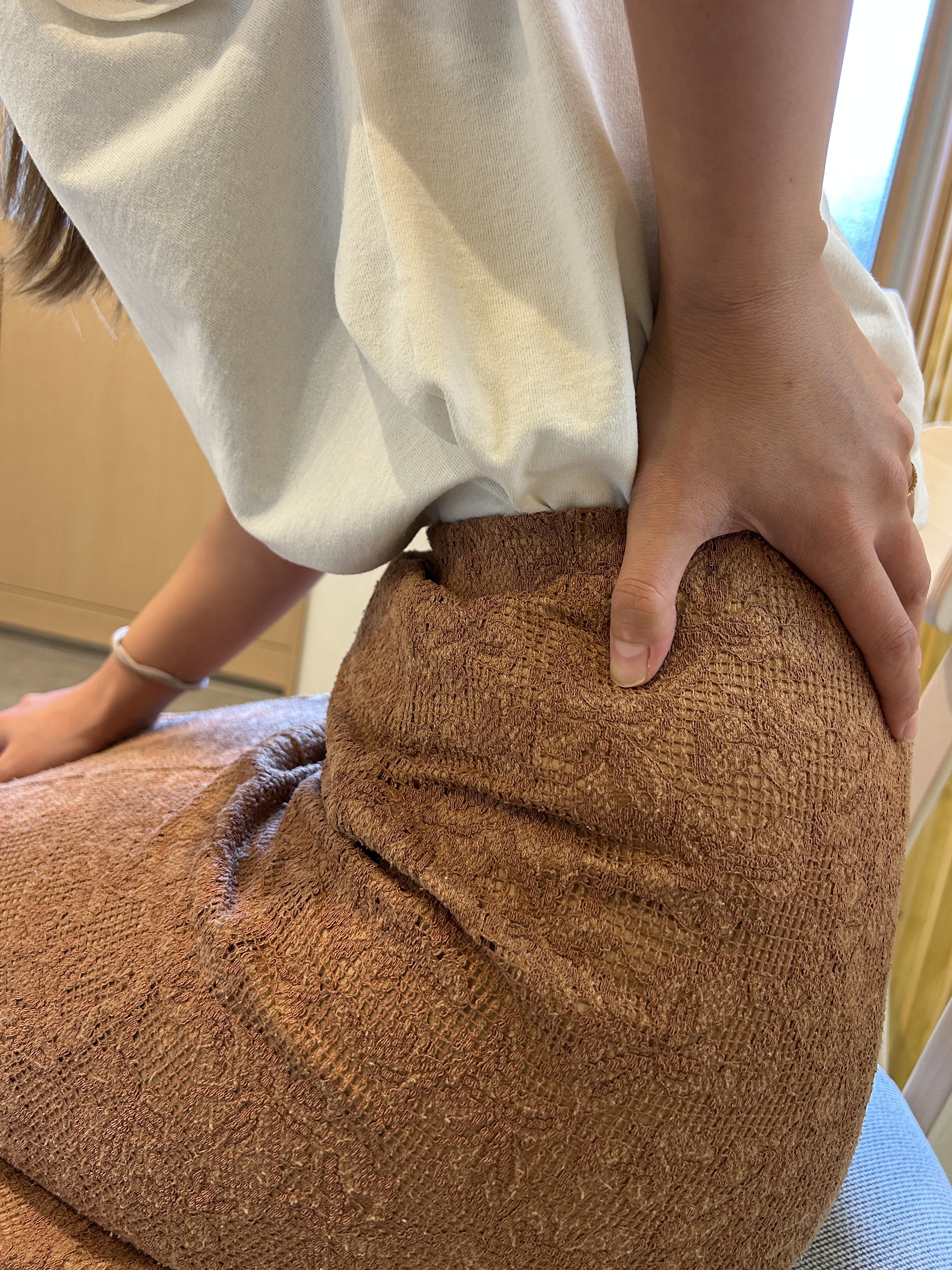腰の後ろに小さなクッションを当てると自然に姿勢が保てます。